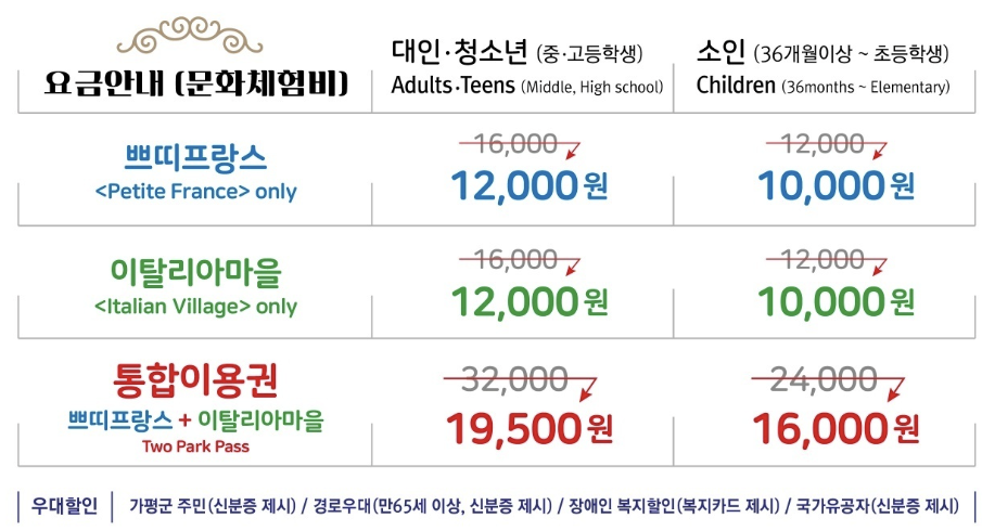 피노키오 페스티벌의 입장권은 ‘쁘띠프랑스 & 이탈리아마을’ 통합 입장권으로 이용 가능합니다.