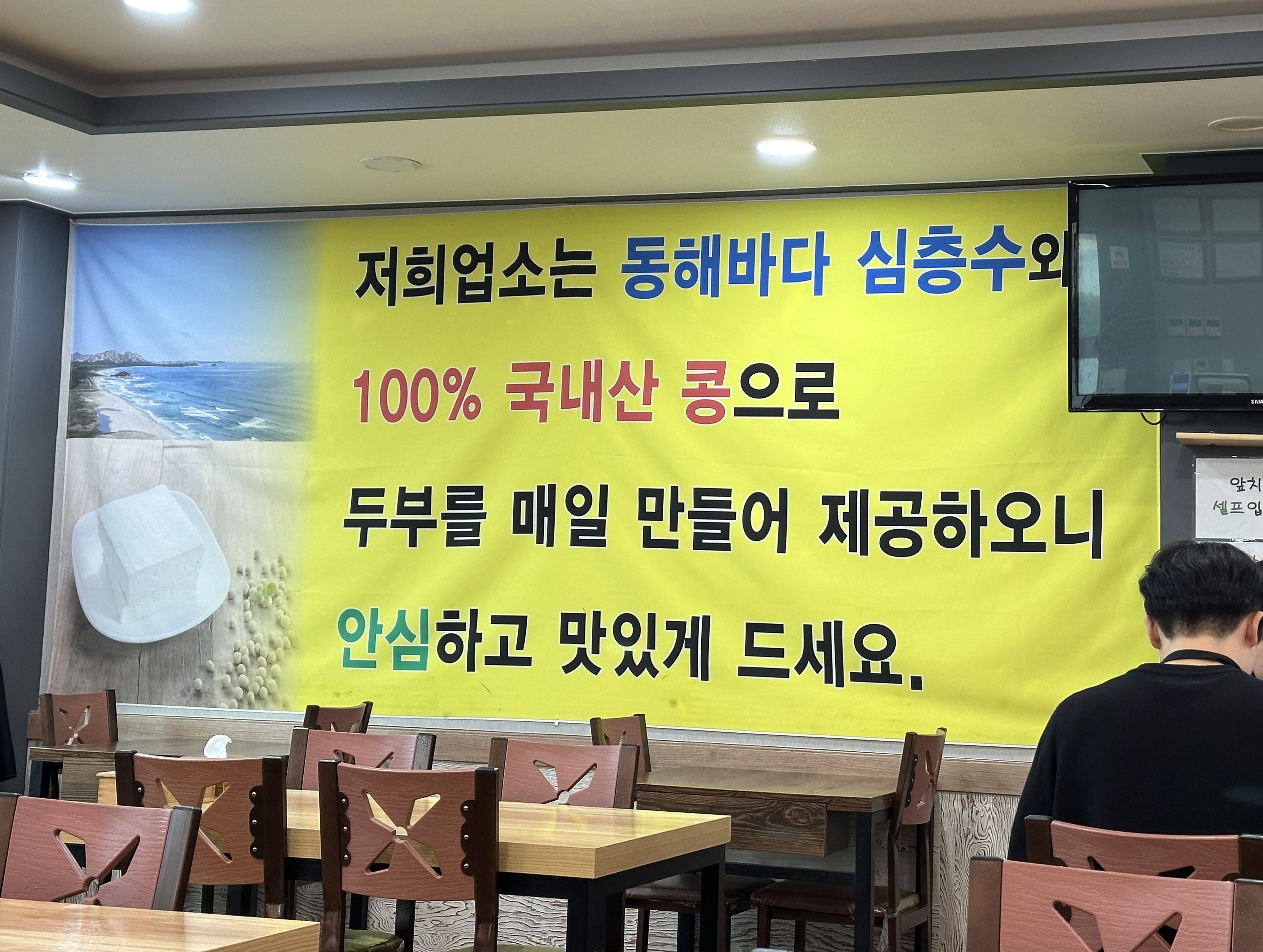 벽면에는 동해바다 심층수 + 100% 국내산 콩으로 매일 두부를 만든다는 설명이 적혀 있어,
