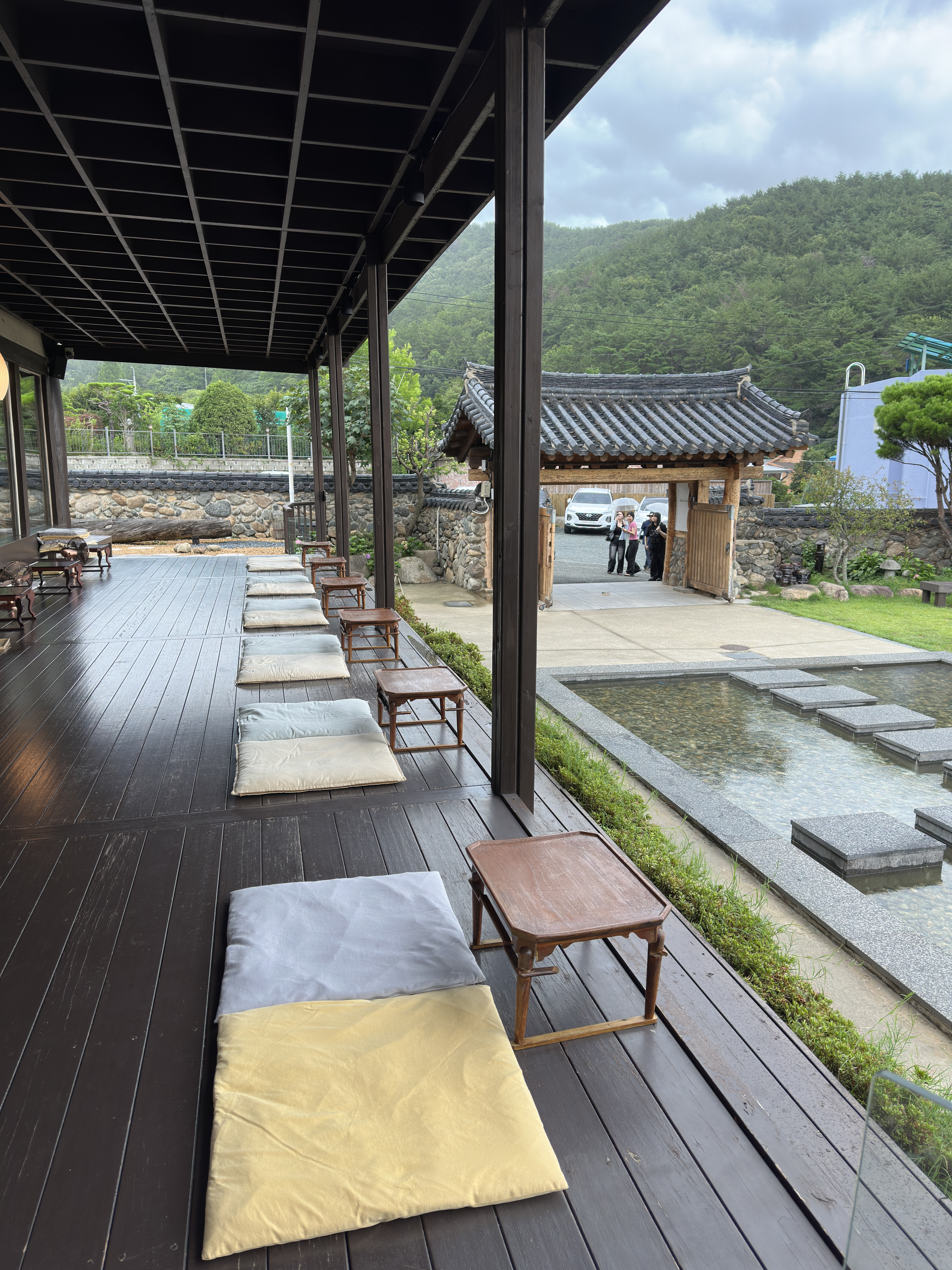 - 처마 아래 대청마루와 평상 테이블: 야외 풍경을 바라보며 커피 한 잔 하기 딱 좋은 자리