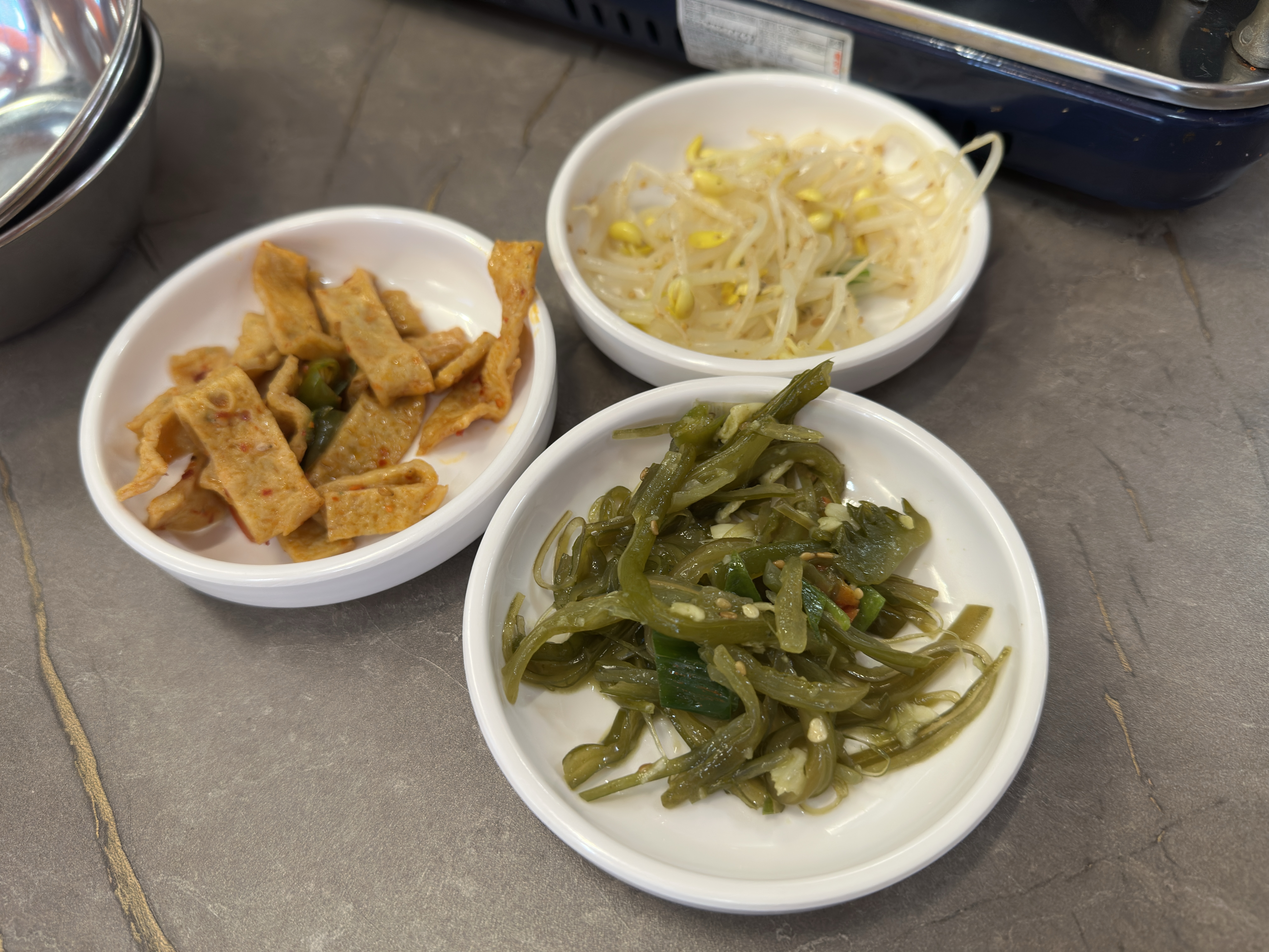 밑반찬은 어묵볶음, 콩나물무침, 미역줄기볶음 3가지였는데, 모두 정갈하고 맛있었습니다. 특히 셀프코너가 큰 장점이에요.