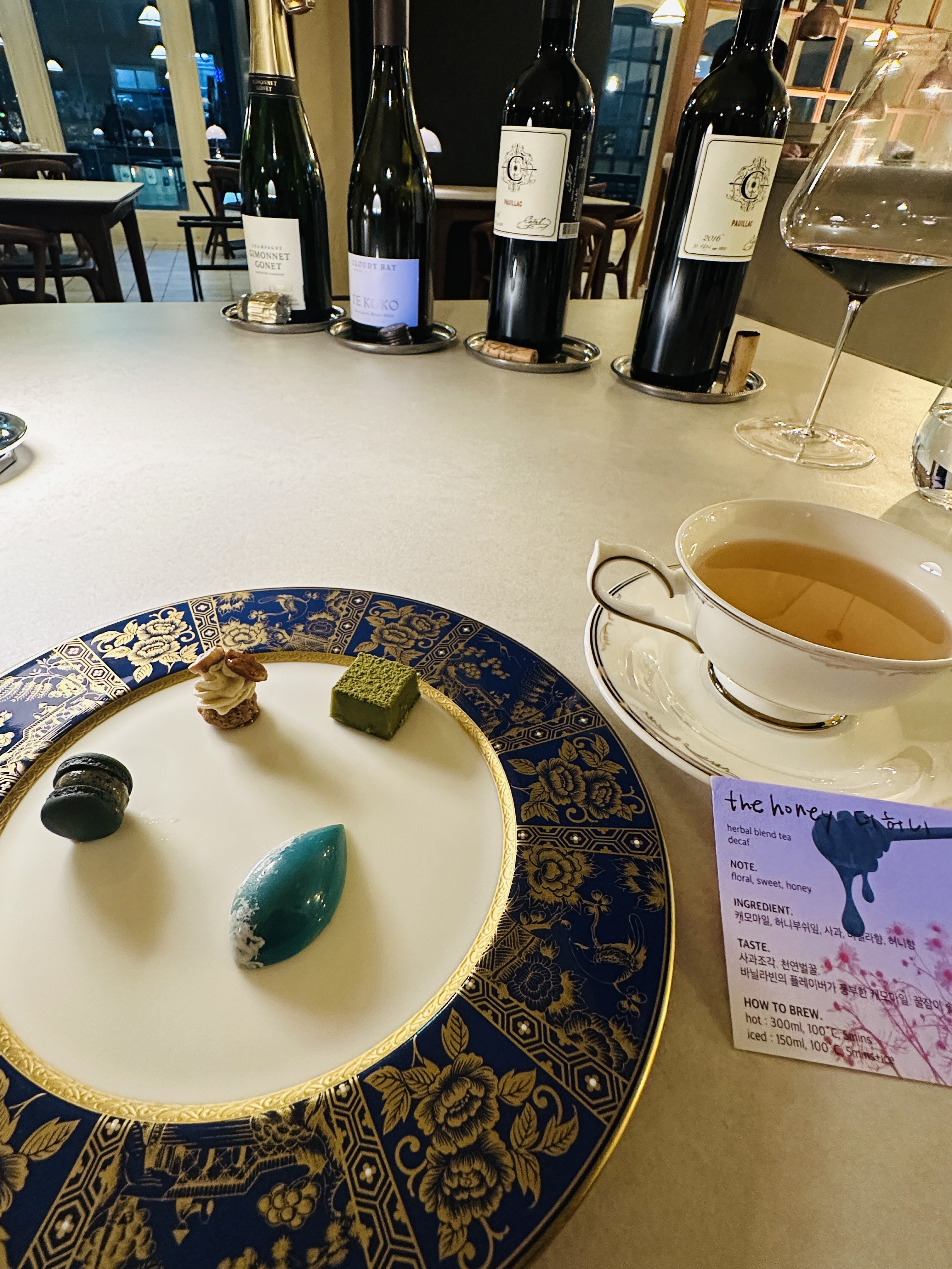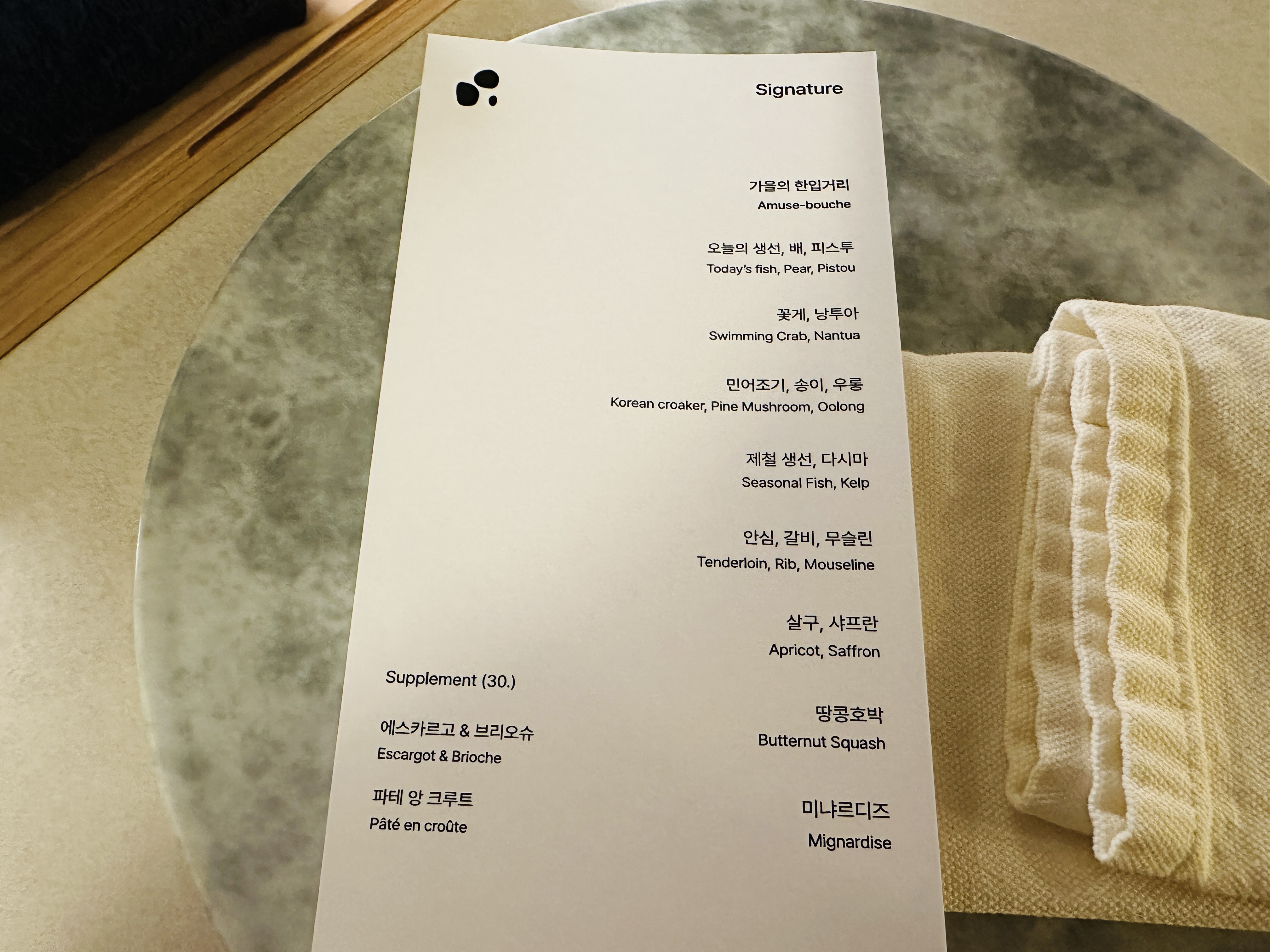 메뉴는 각각의 이름과 조합이 매우 흥미로웠습니다. 예를 들면, ‘가을의 한입거리’라는 아뮤즈부쉬로 시작해, ‘오늘의 생선, 배, 피스투’, ‘꽃게, 낭투아’, ‘민어조기, 송이, 우롱’ 등 재료 본연의 맛을 섬세하게 끌어올린 구성이 인상적이었어요.