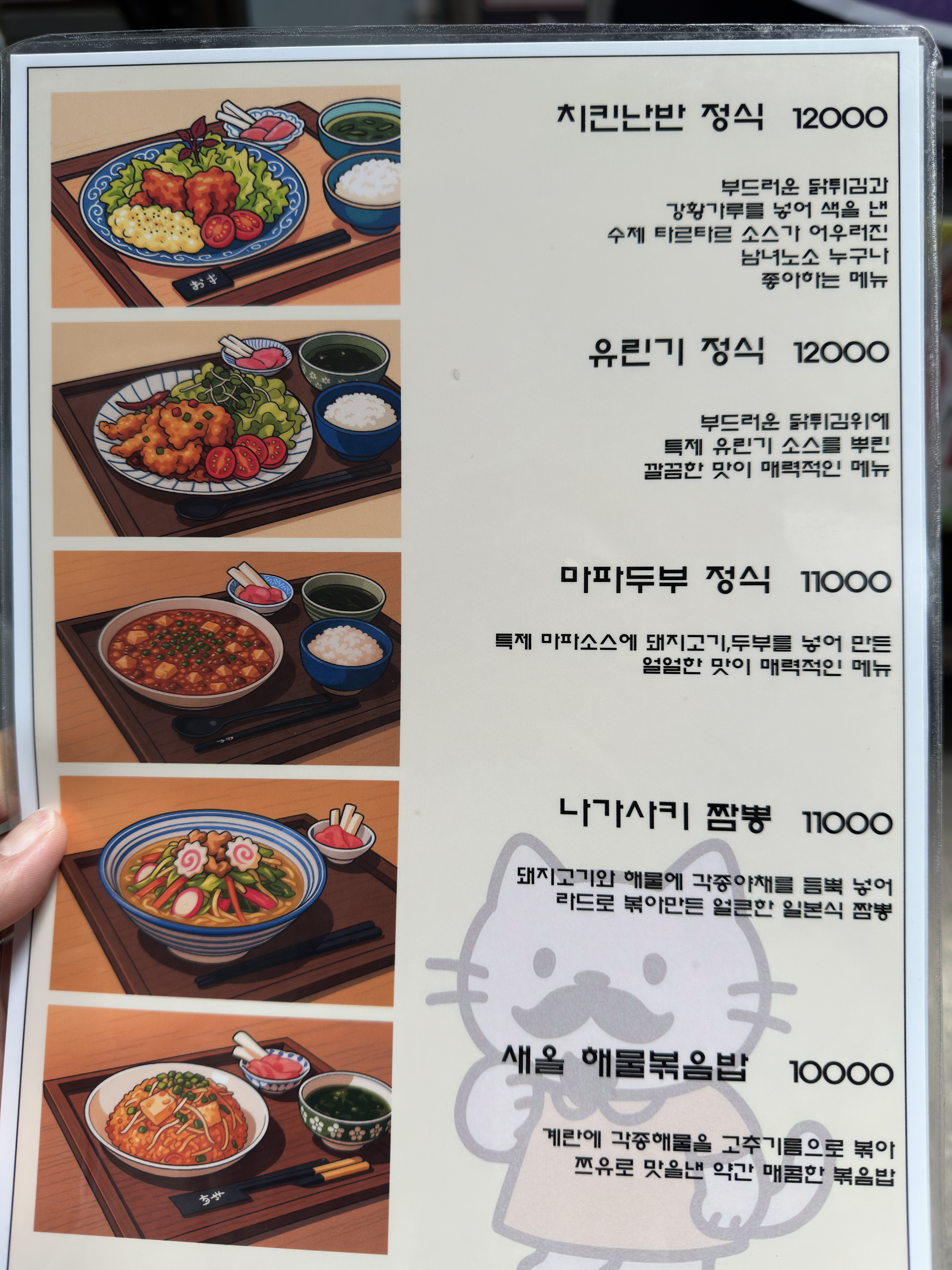 | 마파두부 정식 | 11,000원 | 적당히 얼얼한 부드러운 스타일의 마파소스 |