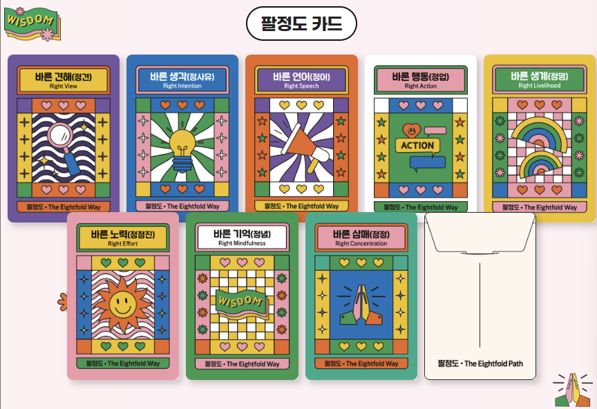 히든담마 이벤트는 삶을 더 건강하고 행복하게 살기 위한 부처님의 8가지 비법, 팔정도 카드를 모아 자신만의 깨달음을 찾는 특별한 이벤트입니다. 박람회장 곳곳에서 다양한 미션을 수행하여 일상 속 행복 습관을 만드는 8가지 지혜를 수집하여 깨달음을 발견할 수 있습니다. 이 챌린지를 통해 삶을 더 건강하고 행복하게 만들 수 있는 기회를 잡아보세요!