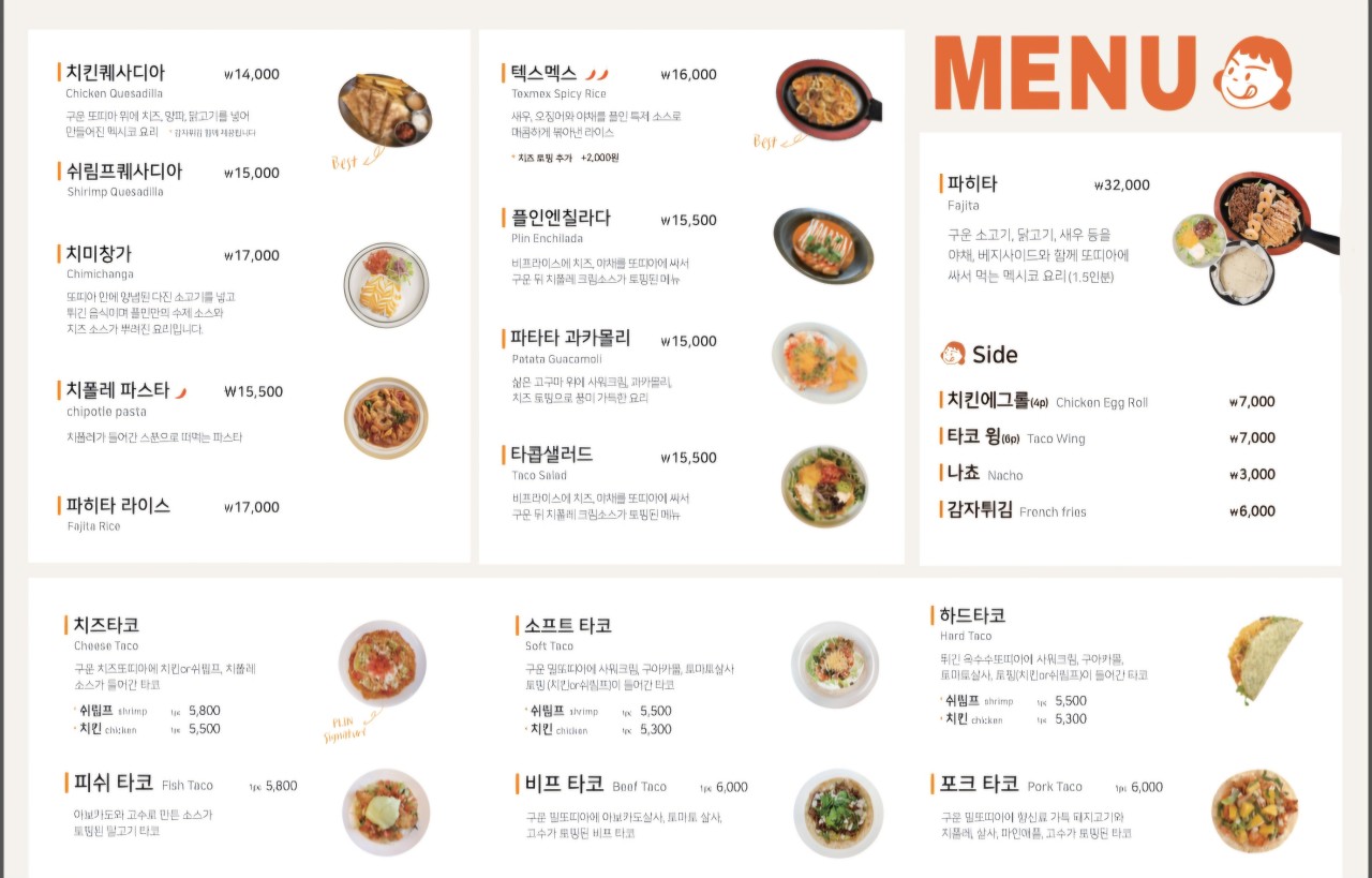 플인에서는 다양한 종류의 타코를 즐길 수 있습니다. 하드타코와 소프트타코 중 선택 가능하며, 치킨, 쉬림프, 포크 등 다양한 재료로 만든 타코를 맛볼 수 있습니다. 특히 고수를 무료로 추가할 수 있어, 고수의 향을 좋아하시는 분들에게는 더욱 매력적인 메뉴입니다.