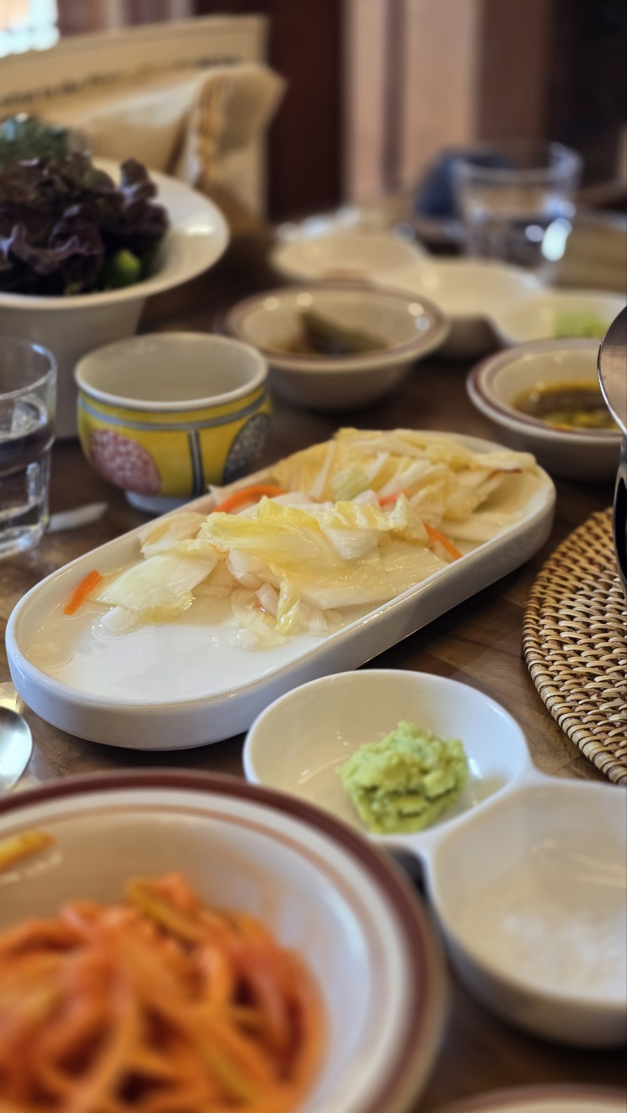 저희는 성인 3명이였고 사진에는 없지만 된장찌개와 울금밥까지 시켰어요. 3인 모둠 세트가 750g이여서 괜찮았고 그 외에 다른 식사류도 시켜서 양이 충분했어요. 예전에 왔을 때 들기름 막국수를 먹어보았고 이번에 갔을 때 비빔 막국수를 먹었는데 제 입맛에는 비빔 막국수가 더 맛있네요! 된장찌개의 경우 청국장 맛이 나요.