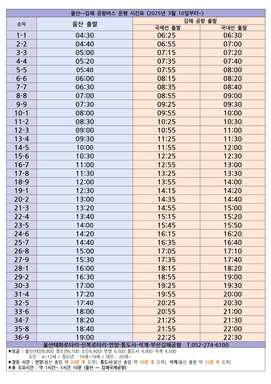 🚌 주요 경로 : 울산(태화, 신복로터리) → 언양 → 통도사 → 석계 → 김해공항