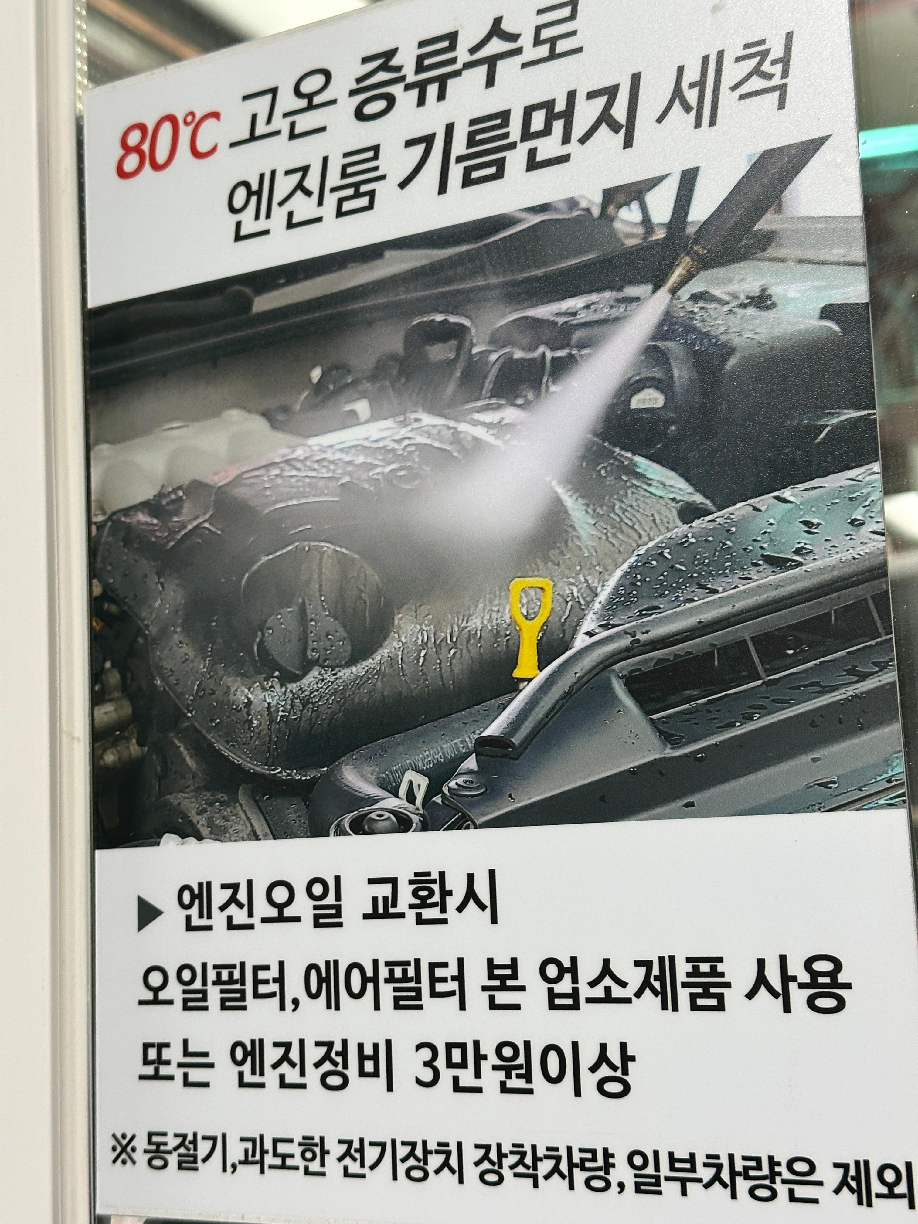 - 80도 고온 증류수로 기름먼지 제거(단, 하이브리드 차량 및 일부 차량 제외)