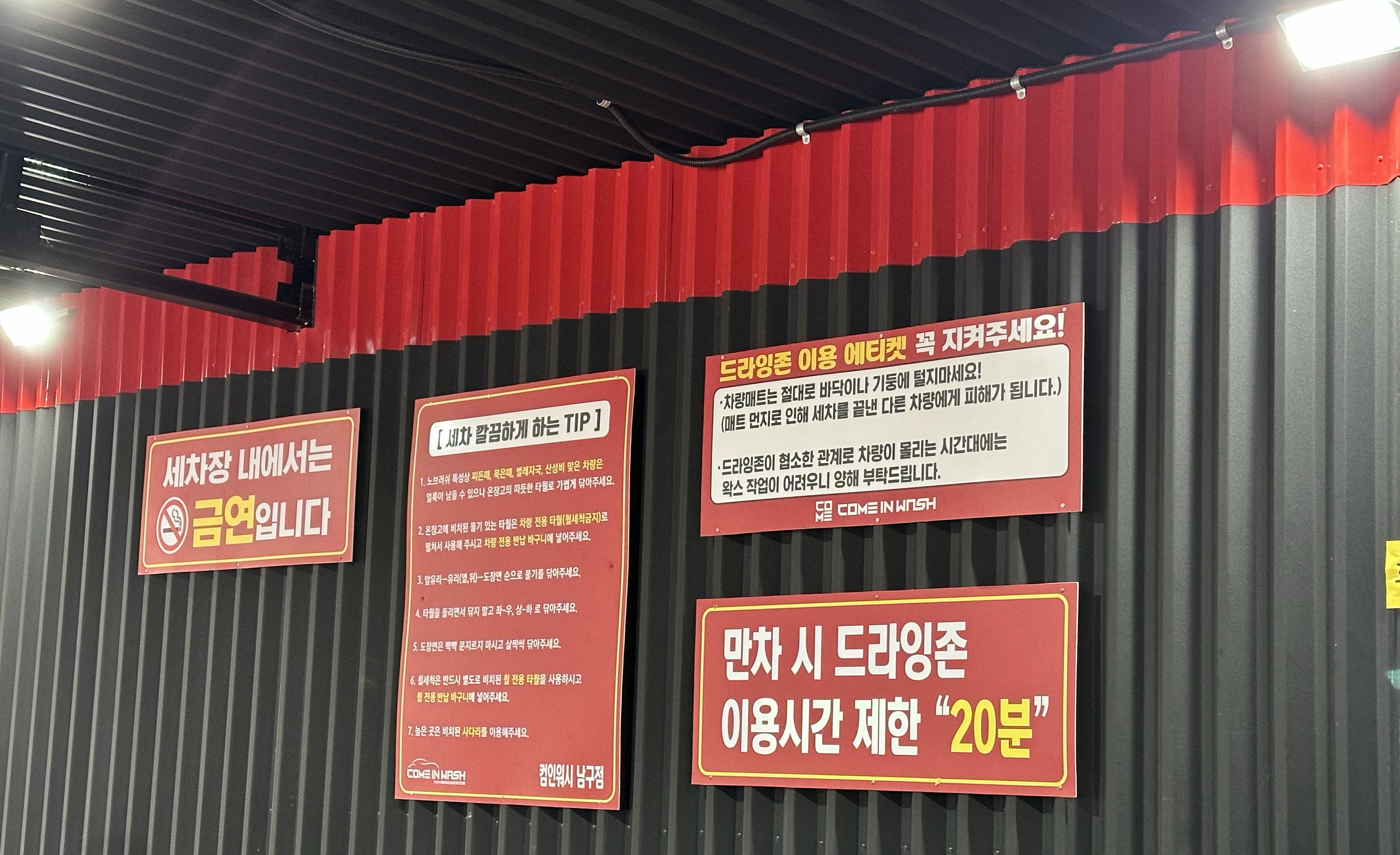또한 바닥 배수 시스템도 잘 되어 있어서 세차 후 미끄럼 걱정도 없었고, 세차장 주변이 청결하게 유지되는 모습도 인상적이었습니다. 이런 디테일한 관리가 컴인워시의 퀄리티를 보여주는 것 같아 더욱 신뢰가 갔습니다.