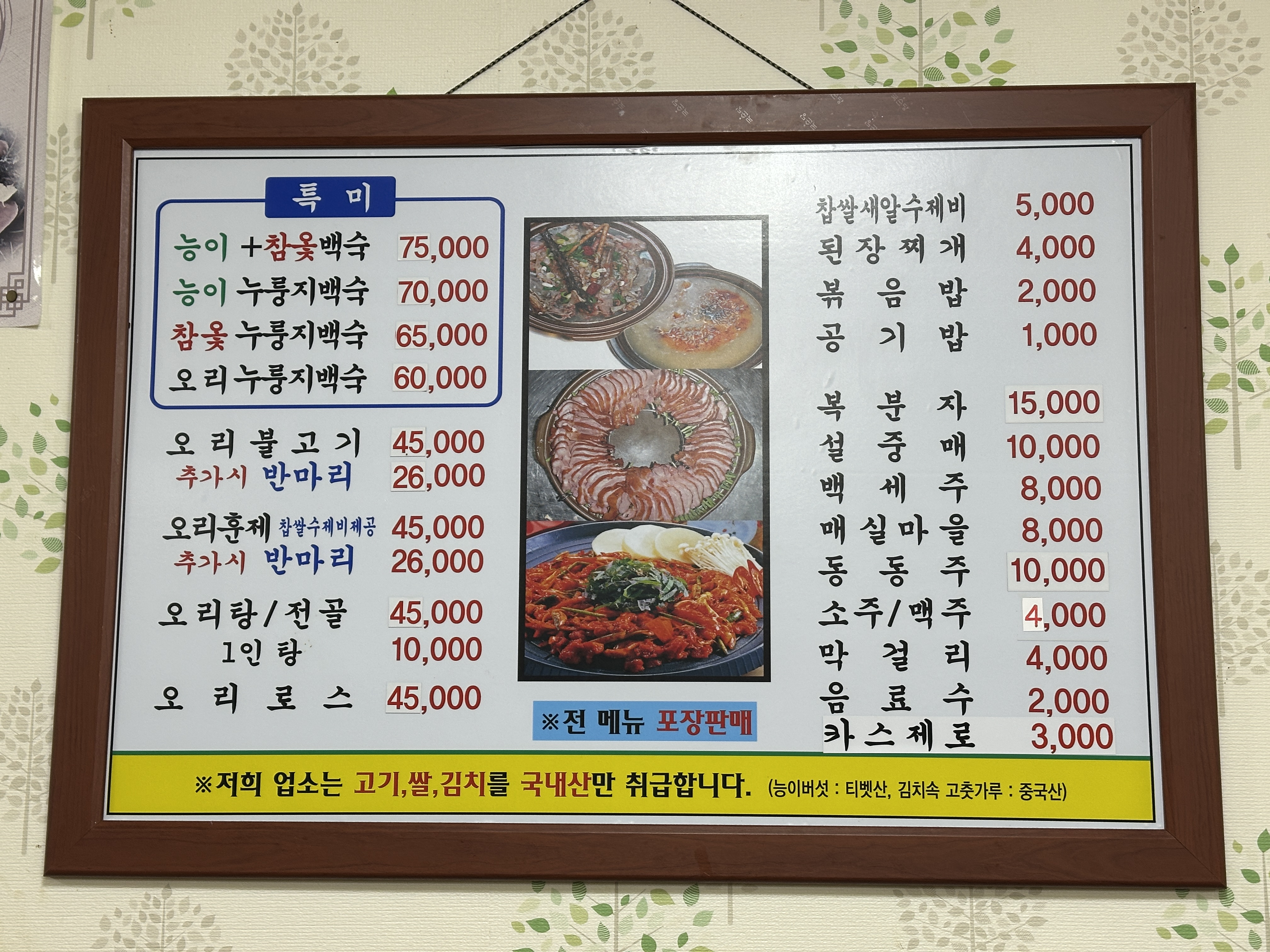 - 추천 메뉴 : 오리불고기, 누룽지 백숙