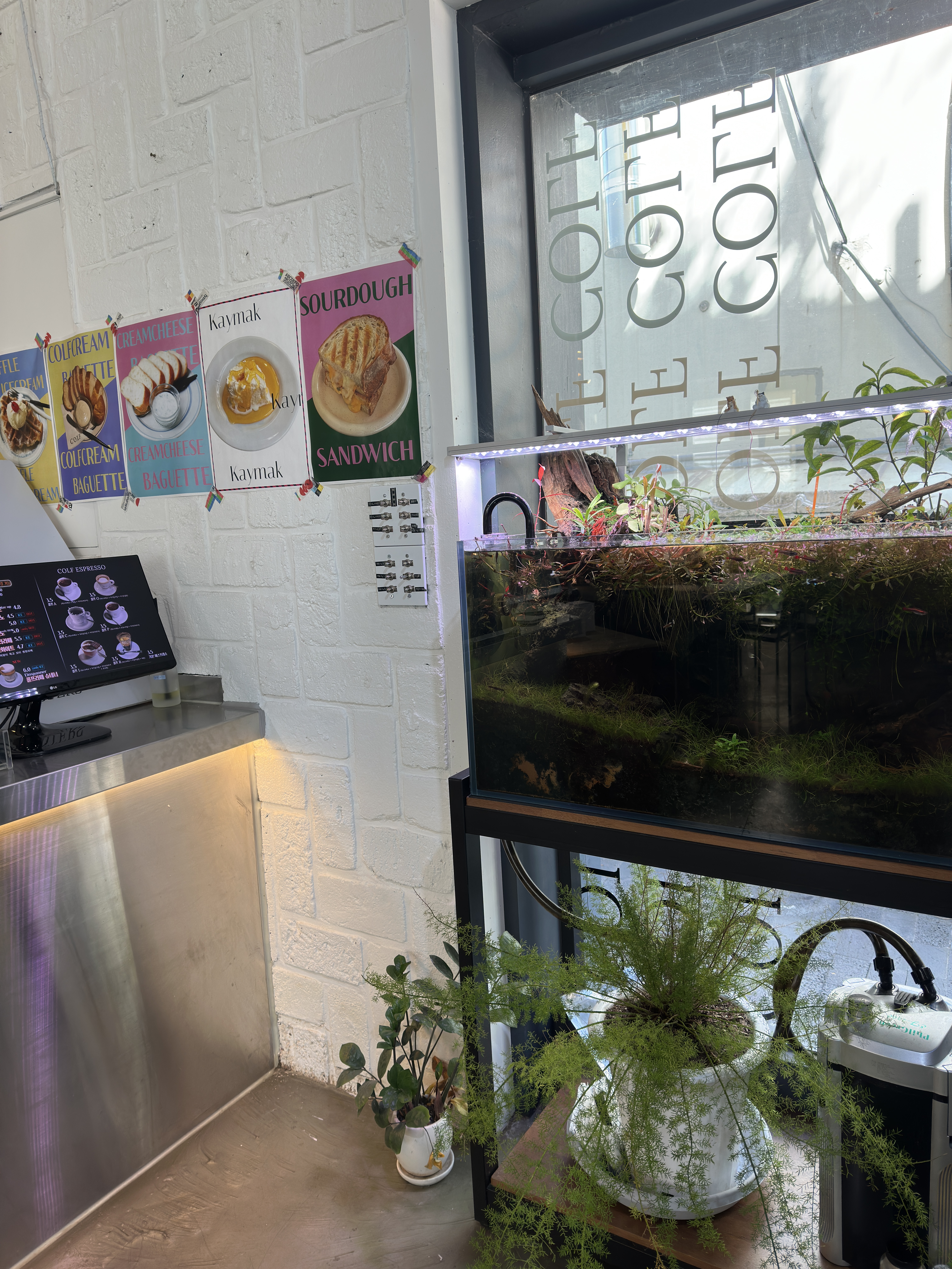 카페 내부는 자극적이지 않은 잔잔한 BGM이 흘러나오고, 곳곳에 놓인 식물과 작은 수족관 속 물고기들이 분위기를 차분하게 만들어줍니다.