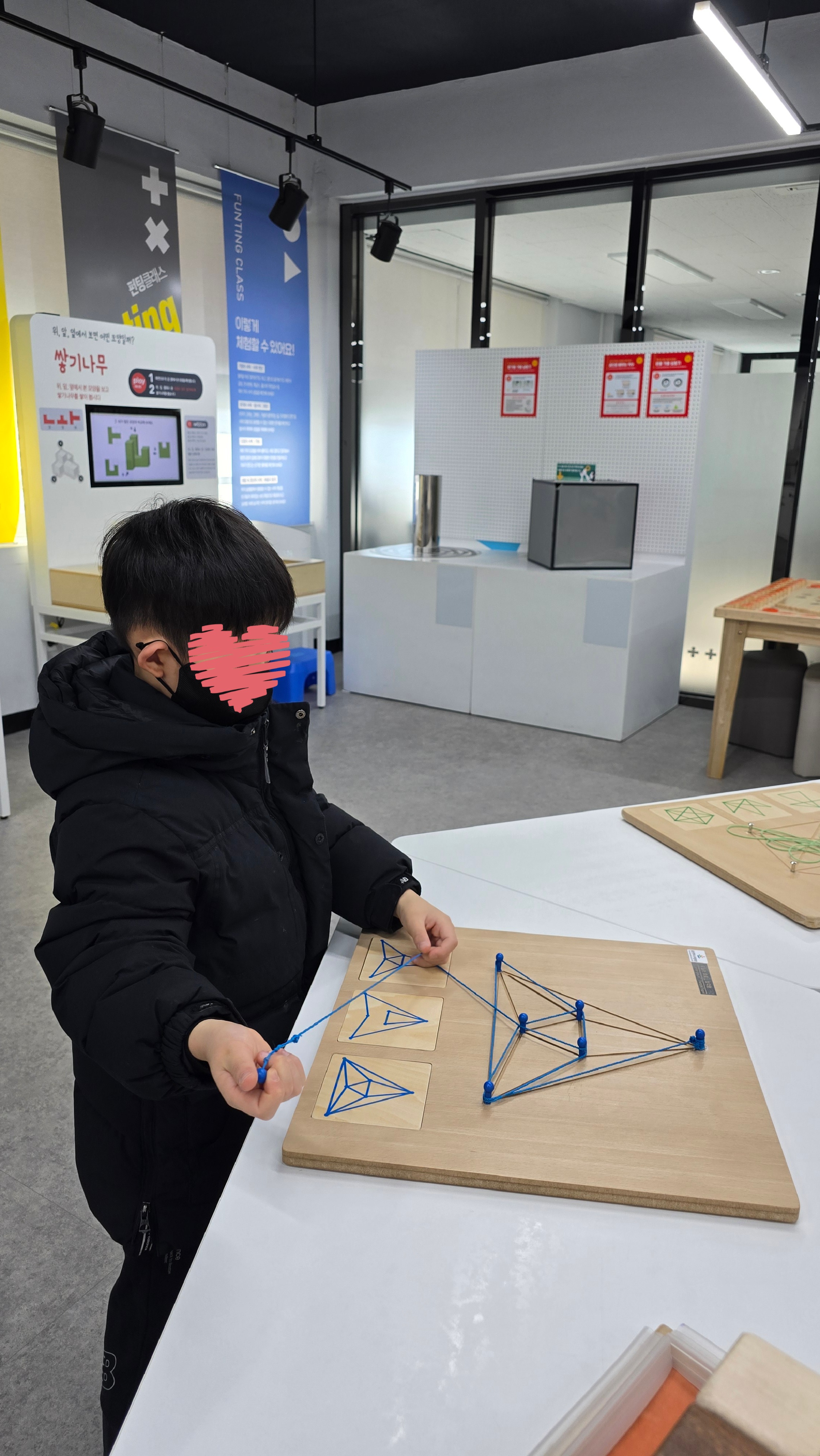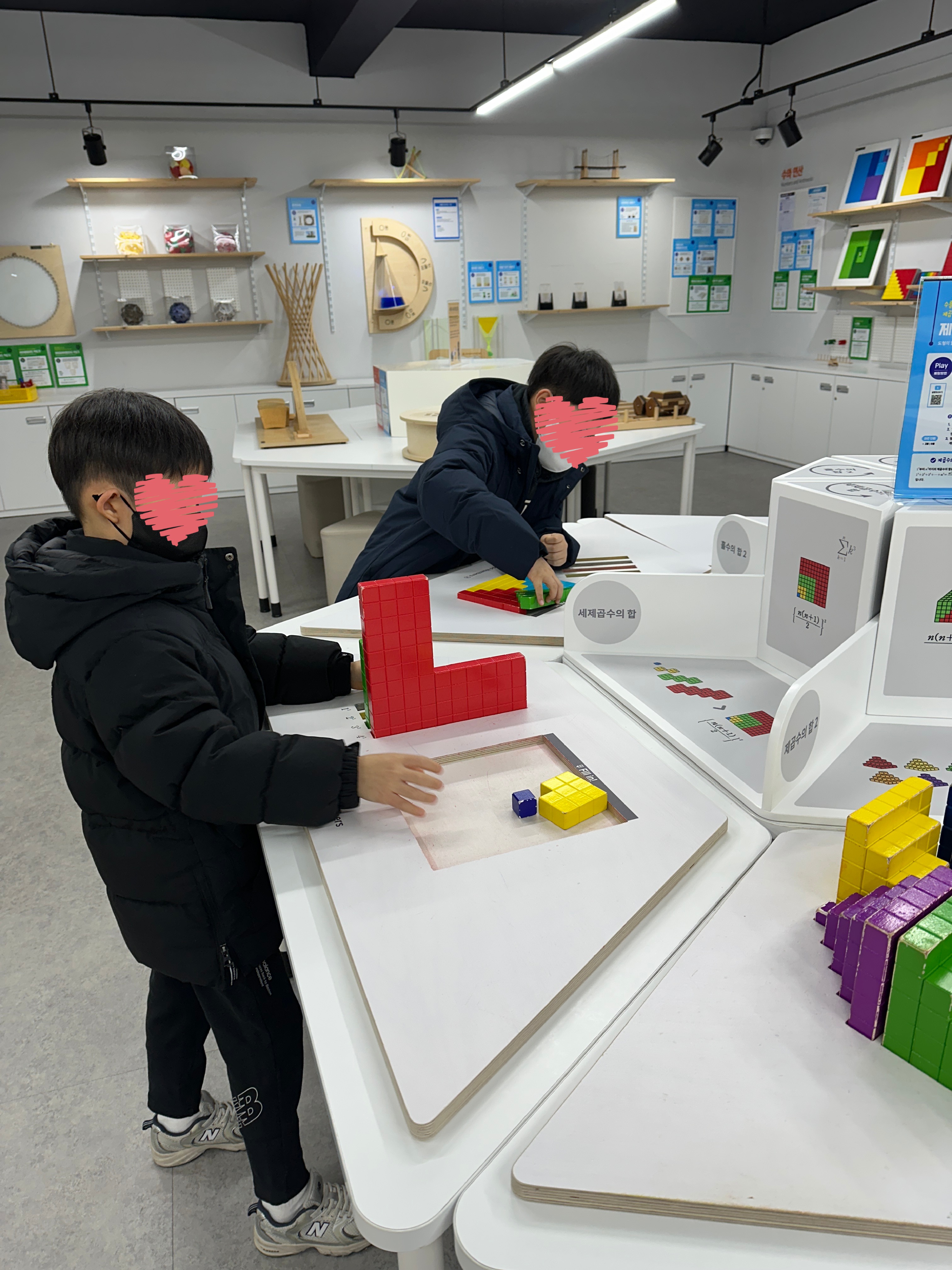 조카들은 게임처럼 즐기면서 자연스럽게 도형, 분수, 비율, 회전 개념을 익힐 수 있었고, 각 체험대마다 간단한 설명이 붙어 있어 어른들도 함께 즐기기 좋았답니다. ‘피타고라스 퍼즐 맞추기’, ‘큐브 분해와 재조립’, ‘비율에 따라 움직이는 톱니바퀴 장치’ 등 아이들이 흥미를 가질 만한 활동이 많았어요.