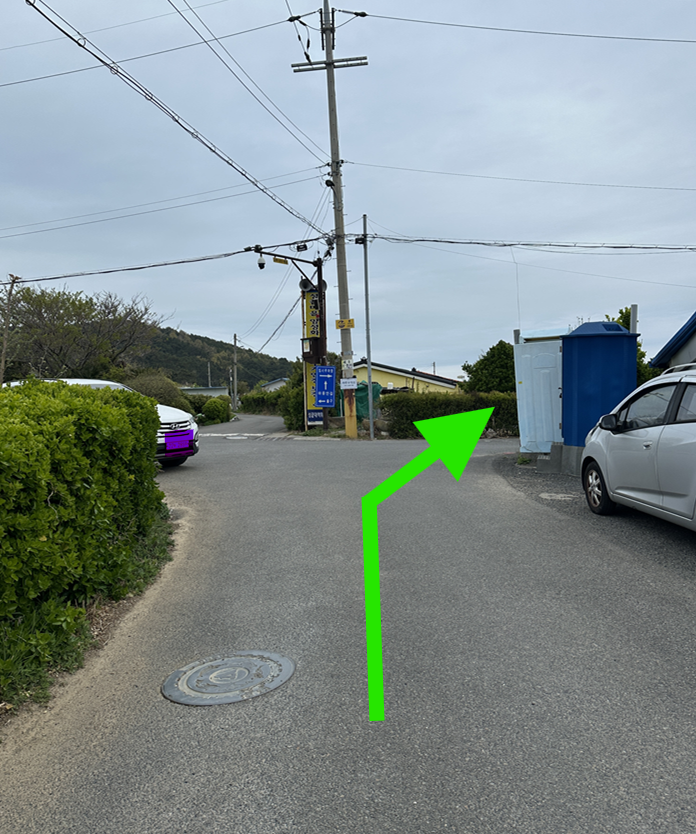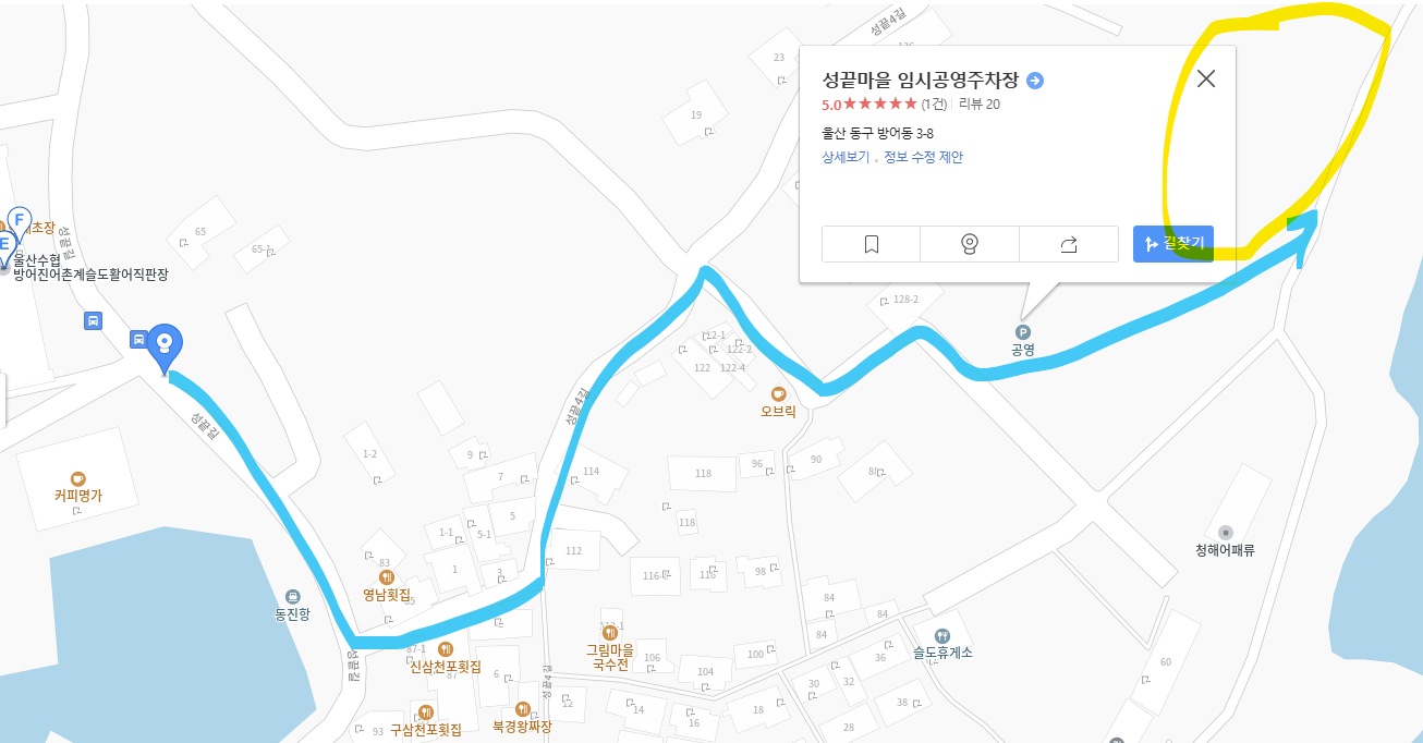 아래 사진을 참고하여 신삼천포 횟집 옆으로 쭉 직진 → 집이 정면에 보이면 왼쪽 → 절을 지나서 오른쪽(연두색 화살표)으로 가면 성끝마을 임시 공영 주차장이 보이고, 좀 더 걸어가면 유채꽃밭이 시작됩니다.