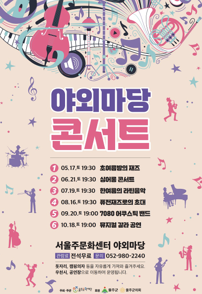 2025년 울주문화재단이 주최하는 ‘문화마당 콘서트’는 4월부터 10월까지 매주 토요일마다 울주 전역의 다양한 문화공간에서 열리는 무료 야외 공연 시리즈입니다. 지역 주민과 방문객 모두가 편안하게 문화예술을 즐길 수 있도록 기획된 본 콘서트는 울주문화예술회관 잔디마당, 물내음 공원, 서울주문화센터, 온양문화복지센터 등 총 4곳에서 릴레이 형식으로 펼쳐지며, 클래식, 재즈, 국악, 대중음악 등 장르를 넘나드는 무대를 선보입니다.🌟