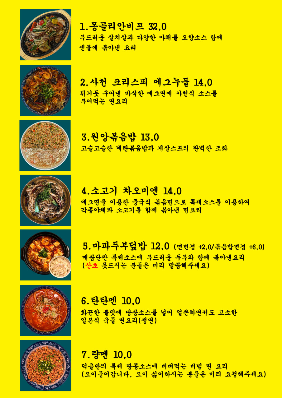 얇은 에그면을 바삭하게 튀긴 후, 해산물이 풍부하게 들어간 사천식 매콤한 소스를 부어 즐기는 요리입니다. 면의 바삭함과 소스의 매콤함이 어우러져 독특한 식감을 선사합니다. 처음 접하는 분들에게는 생소할 수 있지만, 한 번 맛보면 잊기 어려운 매력을 지니고 있습니다.