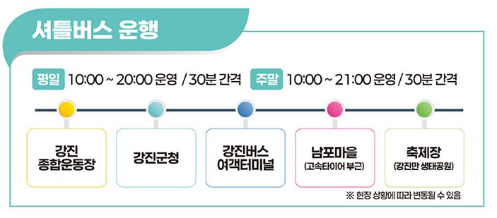 강진종합운동장 ↔ 강진군청 ↔ 강진버스여객터미널 ↔ 남포마을 ↔ 축제장