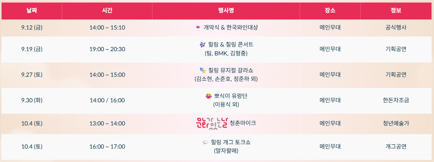 또한, 상시 프로그램으로 국악 버스킹, 해외 민속공연 CIOFF, 청춘마이크까지 이어져, 와인과 국악을 함께 즐길 수 있는 축제라는 점이 매력입니다.