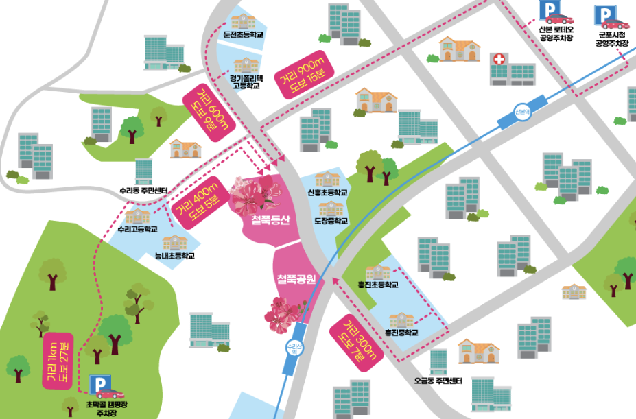 군포 철쭉축제가 열리는 철쭉동산은 경기도 군포시 산본로 307 일대에 위치해 있으며, 대중교통과 자차 모두 접근성이 좋습니다.