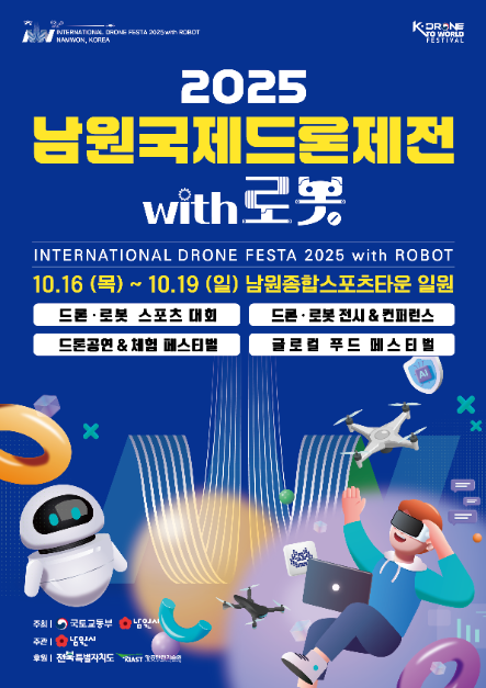2025년 10월 16일부터 19일까지 남원종합스포츠타운에서 열리는 남원 국제드론제전 with 로봇은 드론과 로봇의 모든 것을 만나볼 수 있는 글로벌 축제입니다. 세계 최정상급 선수들이 펼치는 국제 DFL 드론 레이싱 대회부터 로봇 체험, 기술 컨퍼런스, 드론 퍼포먼스 쇼, 그리고 글로벌 푸드 페스티벌까지! 미래 기술과 문화가 융합된 특별한 4일간의 현장을 소개합니다.