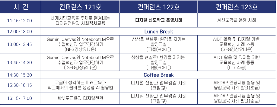 현장에서는 3개소의 컨퍼런스장(각 100석 규모)에서 최신 교육 트렌드와 사례 중심의 강연이 진행됩니다. 그중 주목할 만한 특별 강연 프로그램은 아래와 같습니다.