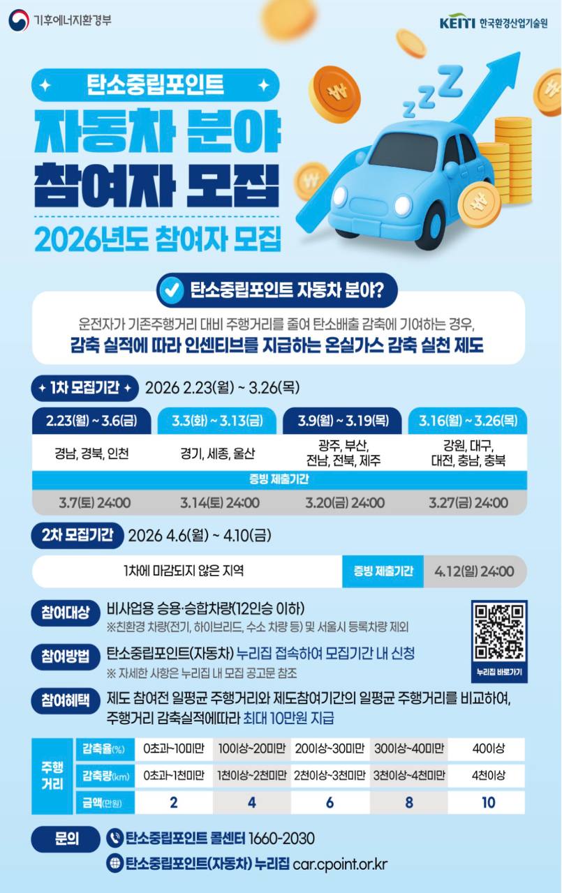 자동차 주행거리를 줄이면 인센티브를 받을 수 있는 2026년 탄소중립포인트(자동차) 참여 신청이 진행됩니다.