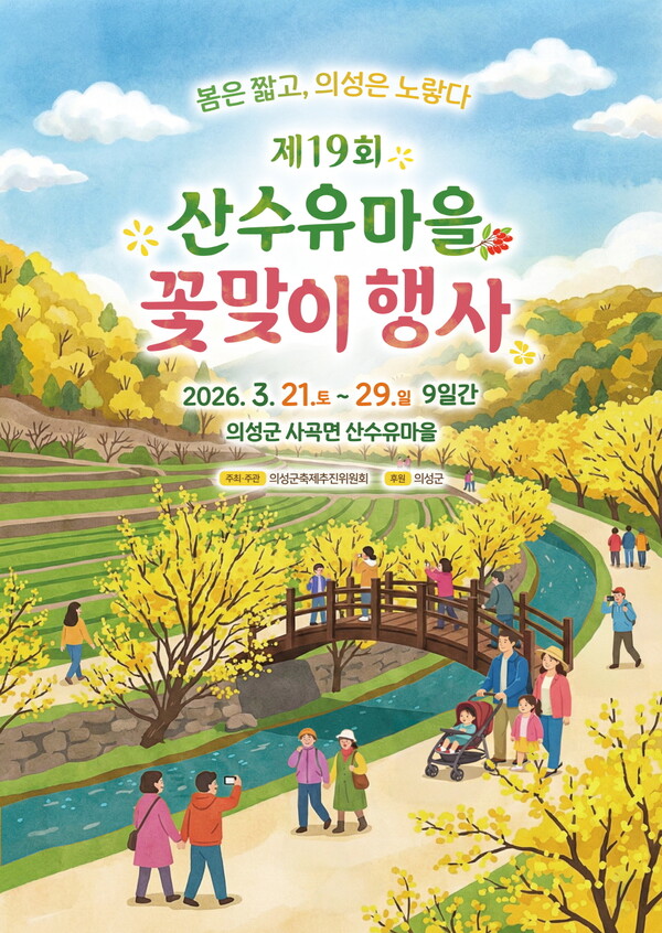 경북 의성 사곡면 산수유마을에서 열리는 제19회 산수유마을 꽃맞이 행사가 3월 21일부터 29일까지 개최됩니다.